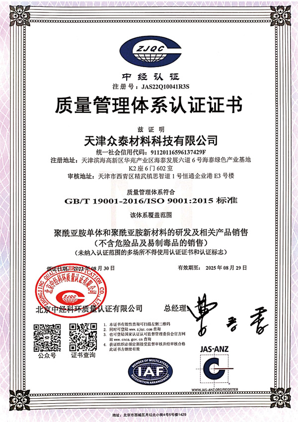 天津眾泰材料科技有限公司(以下簡稱“眾泰”),是一家“以先進功能性聚酰亞胺單體研發(fā)生產(chǎn)為核心,致力于推動全球聚酰亞胺材料產(chǎn)業(yè)發(fā)展”為使命的創(chuàng)新型高新技術(shù)企業(yè)。眾泰研制的聚酰亞胺單體目前已廣泛應(yīng)用于無色透明柔性聚酰亞胺薄膜、柔性顯示材料、5G新材料等諸多高科技領(lǐng)域產(chǎn)品的生產(chǎn)。